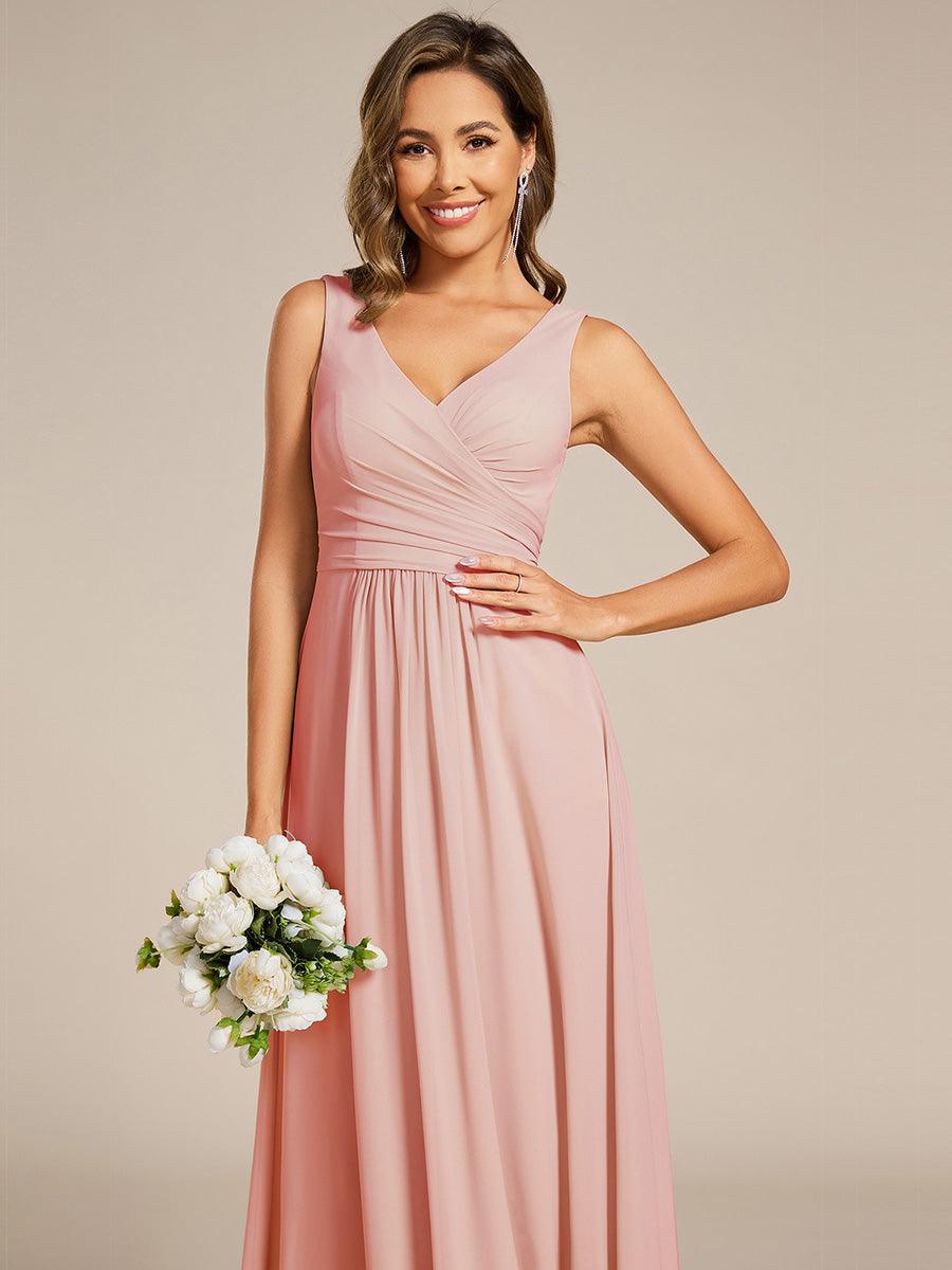 This A-line bridesmaid dress features a flattering pleated design with a V-neckline and delicate straps, crafted from lightweight chiffon for graceful movement. Its sleeveless cut ensures comfort and elegance, making it an ideal choice for formal occasions. The flowing silhouette complements various body types, providing a timeless and sophisticated look for your bridal party.