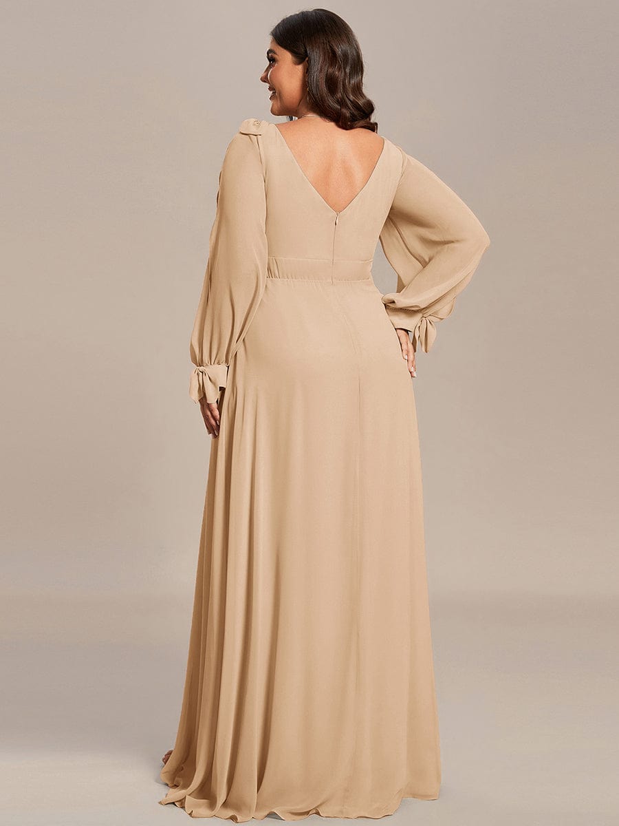 This A-line bridesmaid dress combines elegance and comfort with its flattering plus-size fit. Featuring long sleeves and a sophisticated V-neckline, it offers modest coverage while enhancing your silhouette. The side slit adds a touch of allure and ease of movement, making it perfect for weddings and formal occasions. Crafted to provide both style and confidence, this dress is an excellent choice for bridesmaids seeking a timeless yet modern look.