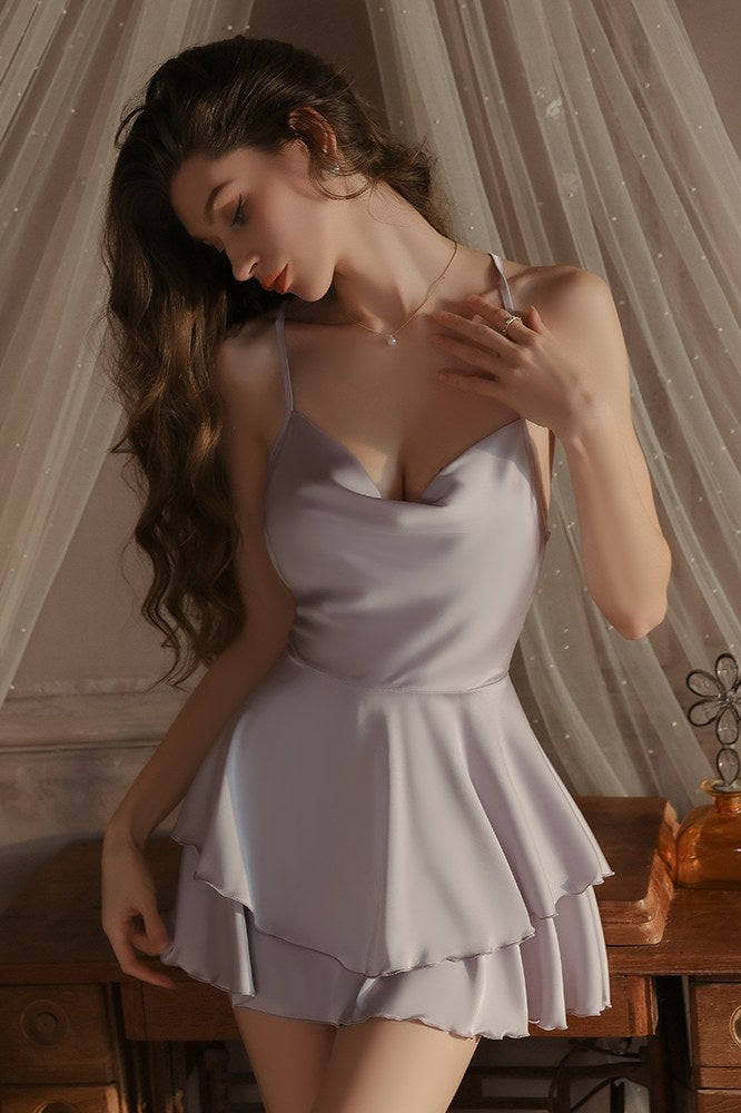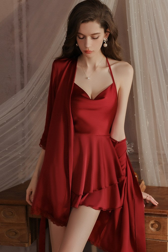 Experience timeless sophistication with this refined two-piece set that marries classic design with contemporary allure. The nightgown showcases delicate spaghetti straps paired with a graceful cowl neckline that drapes elegantly and creates a flattering frame. Tiered construction throughout the garment adds dimension and movement, enhancing the overall aesthetic while providing comfortable wear.
