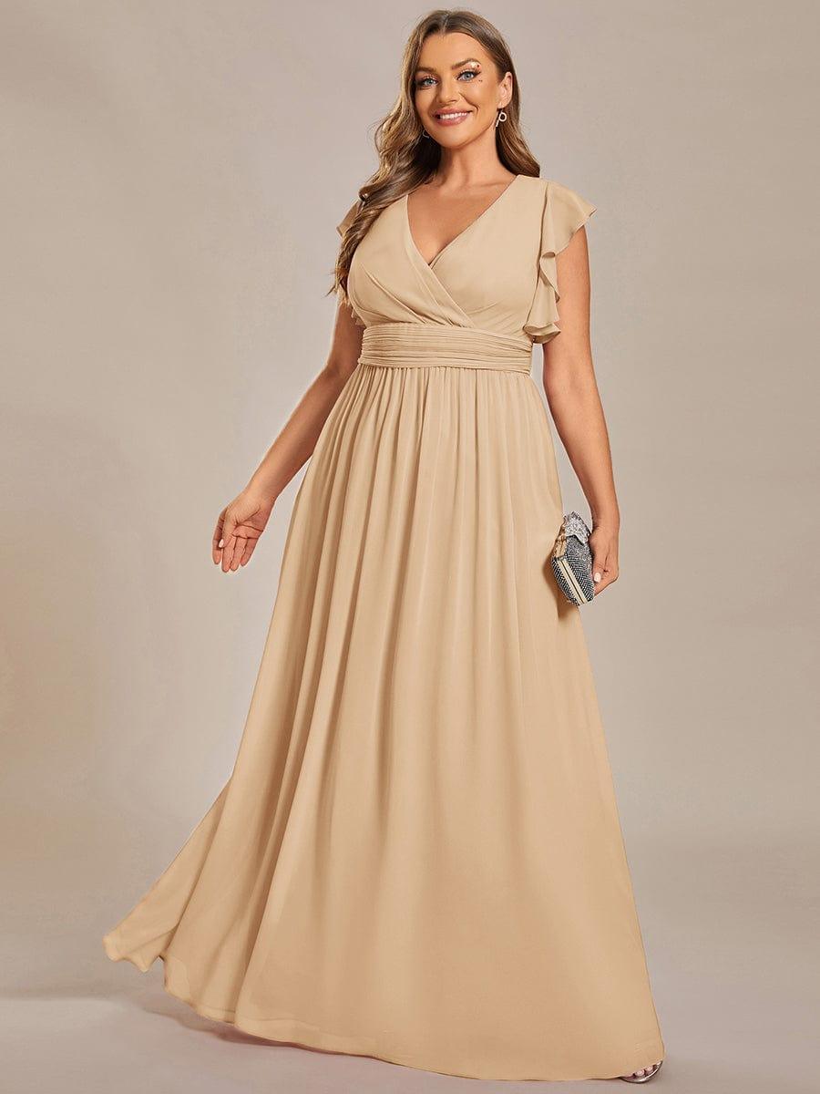 This plus size bridesmaid dress features a flattering A-line silhouette crafted from lightweight chiffon, offering graceful movement and comfort. The V-neck design and empire waist enhance your natural shape, while delicate pleating adds elegant texture. Perfect for formal occasions, this dress combines style and comfort to ensure you look and feel your best throughout the event.